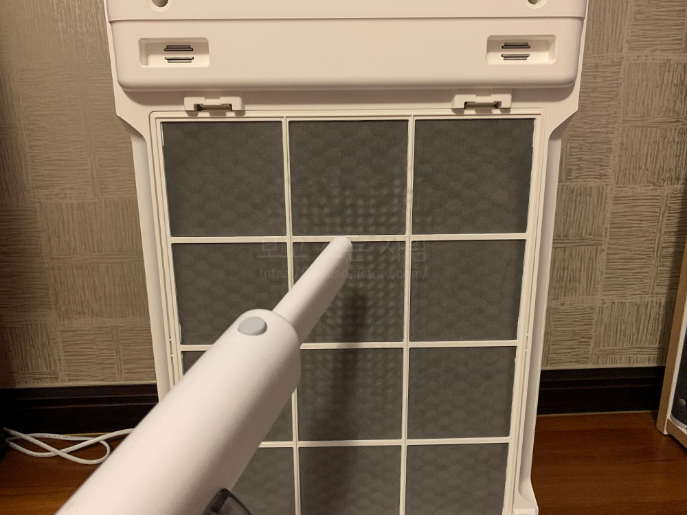 모서리 쪽에 미처 필터에 잡히지 못한 먼지들이 껴있어서 물티슈로 닦아주었다.