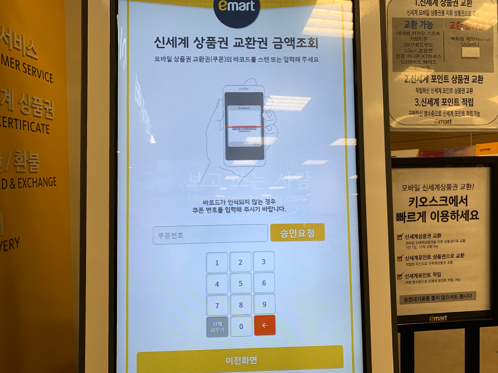무인 교환기는 이마트 상품권 구매처에 설치되어 있다.